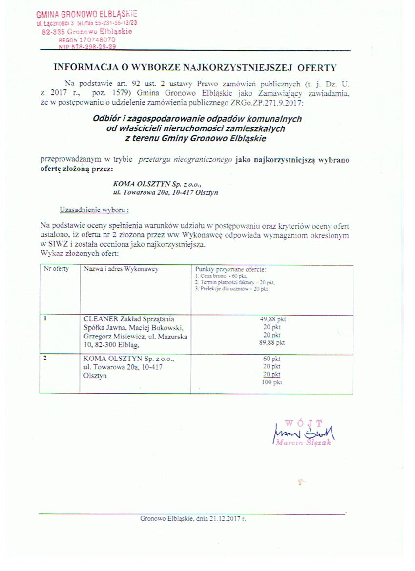 - SIWZ na odbiór i zagospodarowanie odpadów komunalnych od właścieli nieruchomości zamieszkałych z terenu Gminy Gronowo Elbląskie