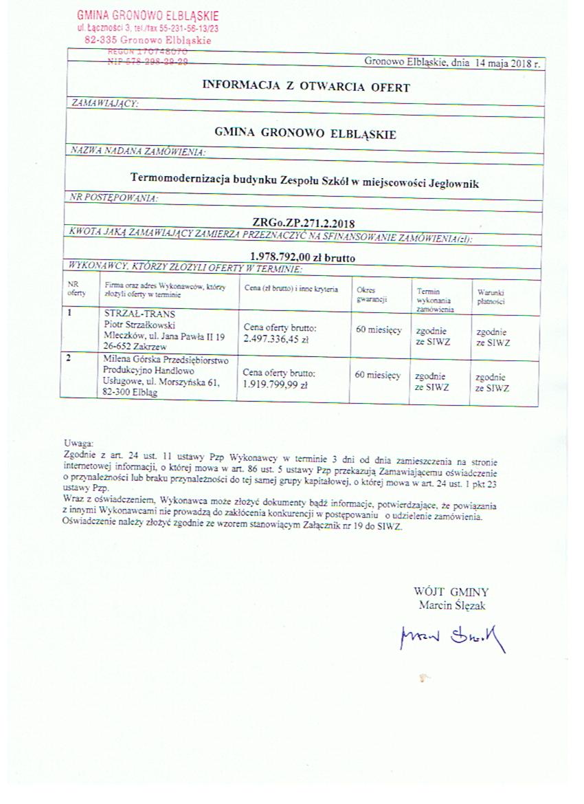 - Ogłoszenie o zmianie ogłoszenia na termomodernizację budynku Zespołu Szkół w miejscowości Jegłownik z dnia 09.05.2018 r.