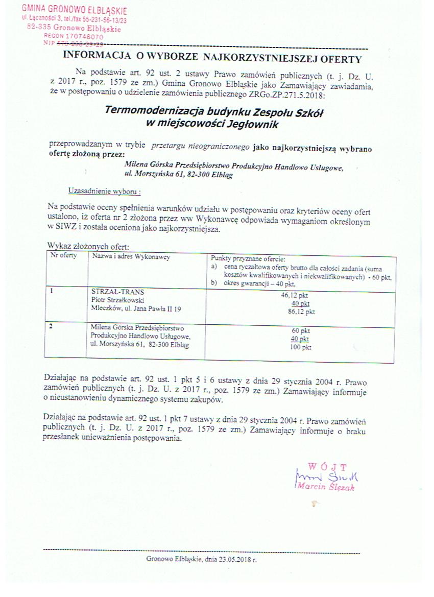 - Informacja o wyborze najkorzystniejszej oferty z dnia 23.05.2018