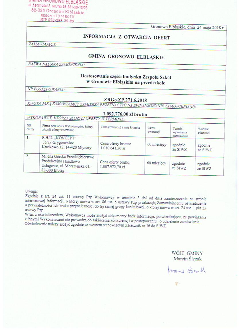 Informacja z otwarcia ofert z dnia 24.05.2018 r.