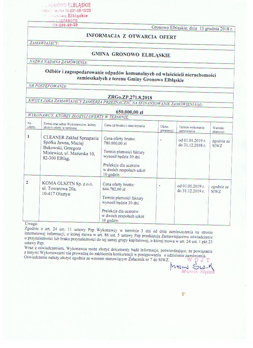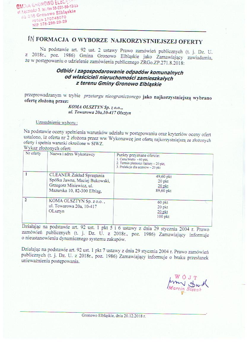 - SIWZ na odbiór i zagospodarowanie odapadów komunalnych od właścicieli nieruchomości zamieszkałych z terenu Gminy Gronowo Elbląskie
