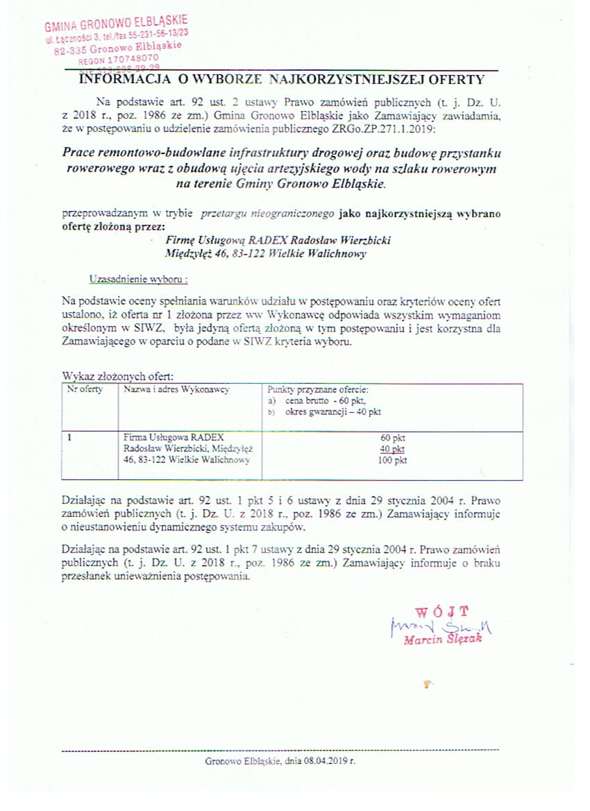 - Informacja o wyborze najkorzystniejszej oferty z dnia 08.04.2019