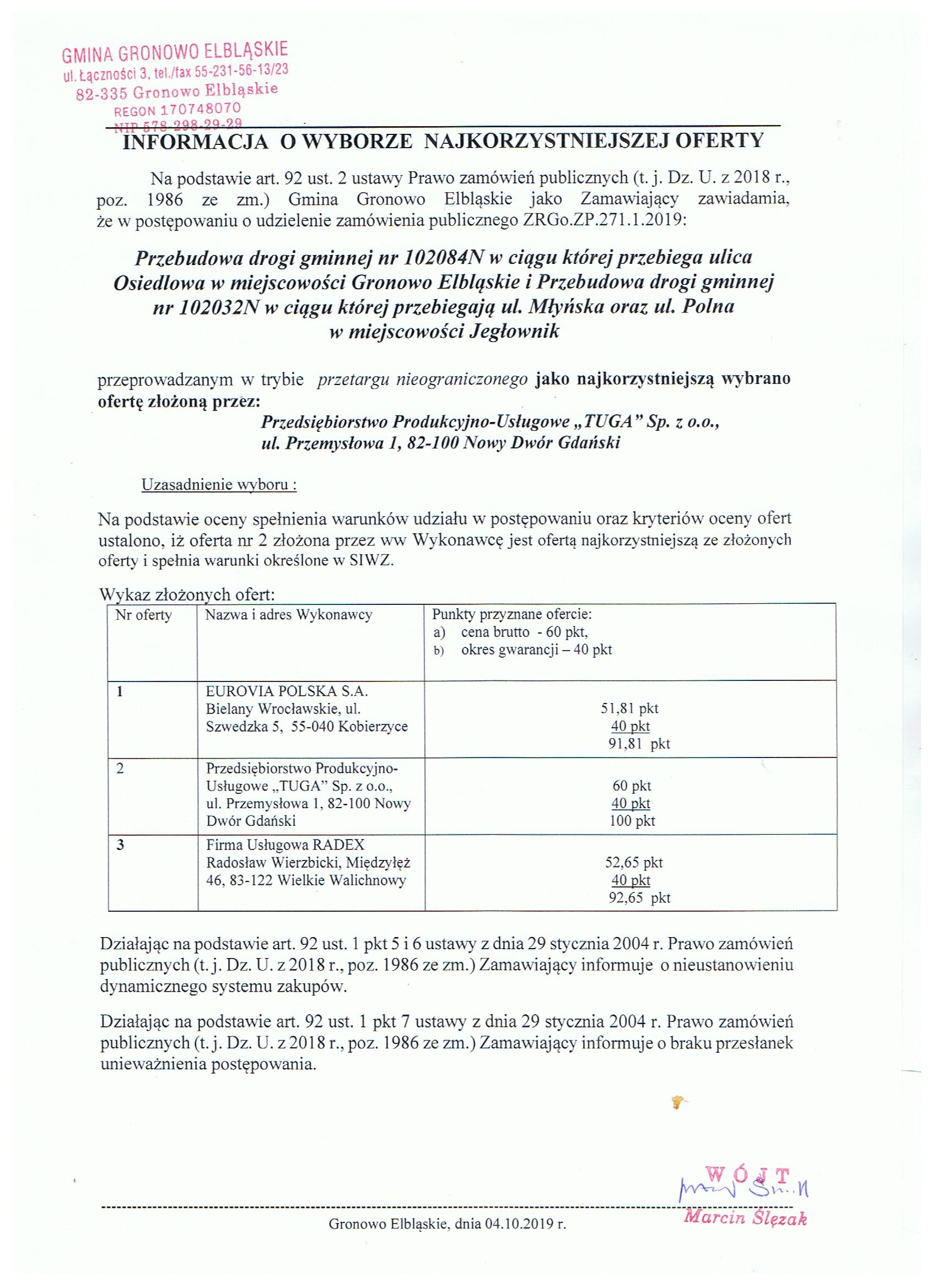 "Przebudowa drogi gminnej nr 102084N w ciągu której przebiega ulica Osiedlowa w miejscowości Gronowo Elbląskie” i „Przebudowa drogi gminnej nr 102032N w ciągu której przebiegają ul. Młyńska oraz ul. Polna w miejscowości Jegłownik”