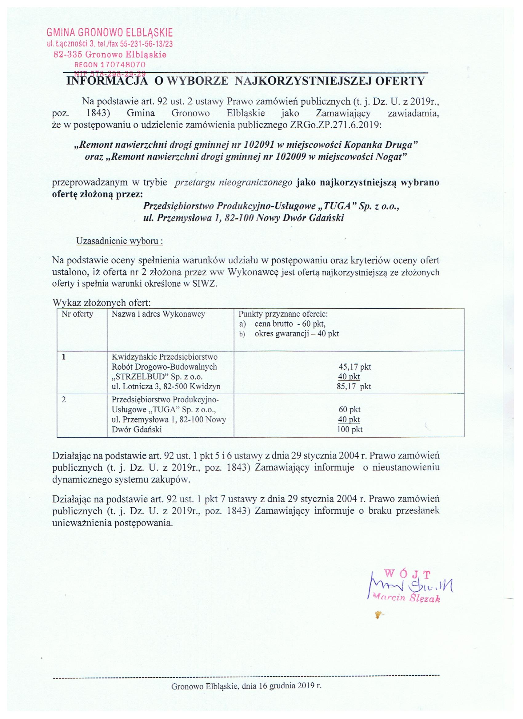 Informacja o wyborze najkorzystniejszej oferty z dnia 16 grudnia 2019r