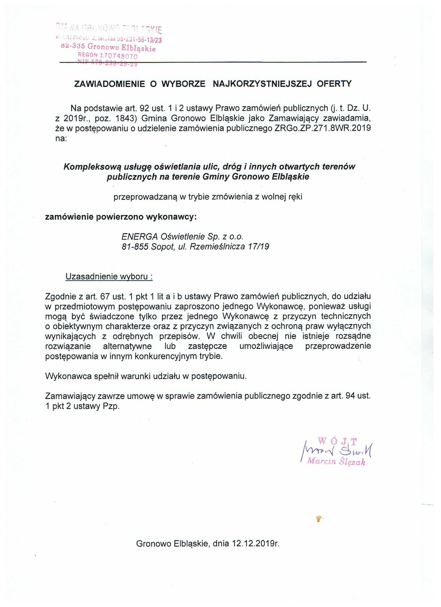 Informacja o wyborze najkorzystniejszej oferty z dnia 12.12.2019r